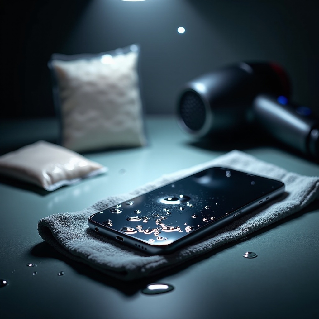No, un secador de pelo puede causar más daño al empujar la humedad hacia adentro con aire caliente. Es más seguro usar métodos de secado pasivo como arroz o gel de sílice.